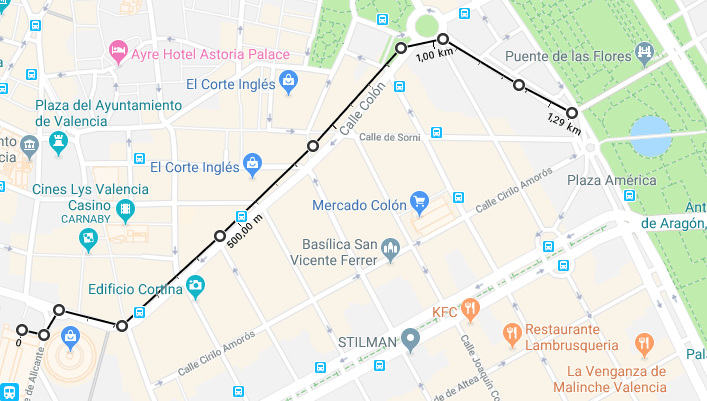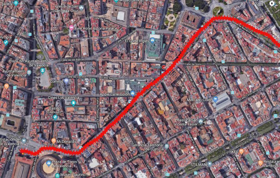 Partirá desde la Estación del Norte de Valencia y recorrerá: Calle Xátiva, Calle Colón y final en Calle Navarro Reverter.